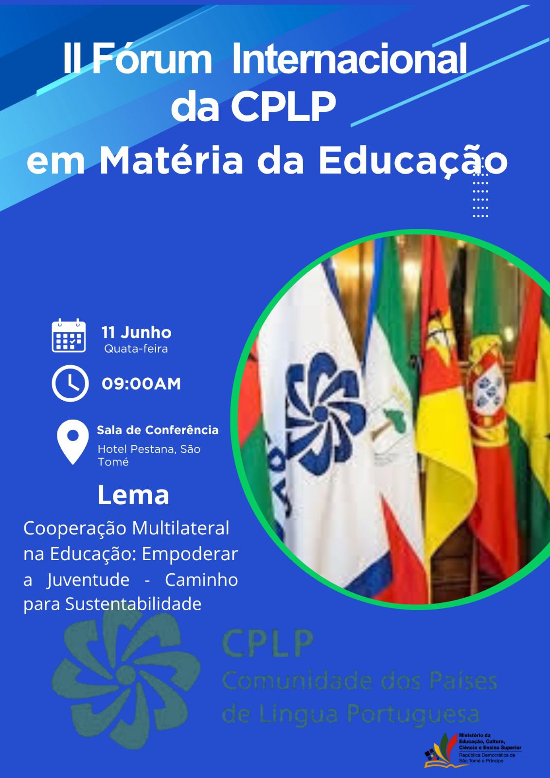 O «II Fórum Internacional da CPLP sobre Cooperação em Matéria de Educação» acontece a 11 de junho de 2025, em São Tomé, sob o lema “Cooperação Multilateral na Educação: Empoderar a Juventude - Caminho Seguro para a Sustentabilidade”.